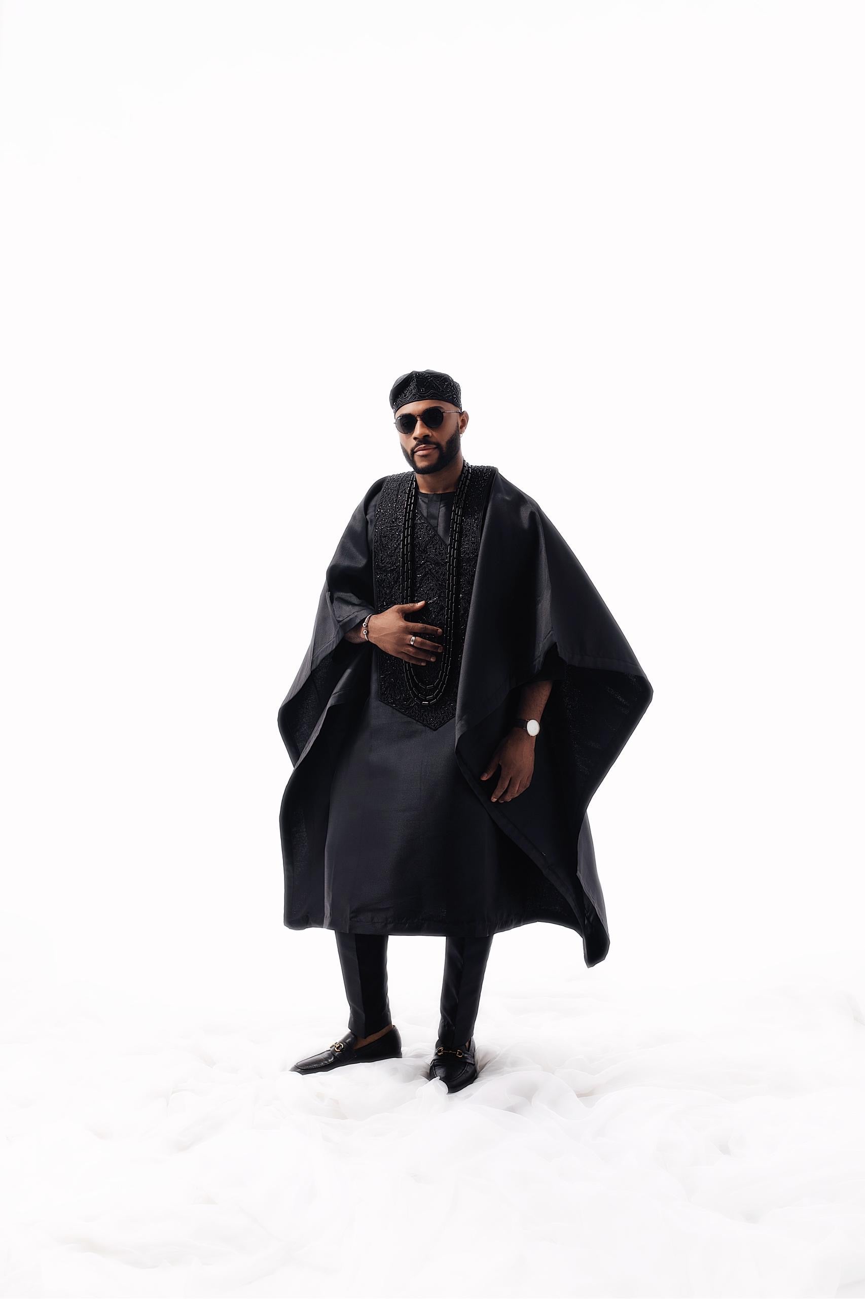 Black Mikado Agbada crafted for kings who walk among men. Made from premium Mikado silk, this ensemble commands attention with its rich luster, fluid drape, and a regal finish that speaks volumes before you utter a word. The intricately hand-embroidered chest panel is a masterpiece of detail—woven with black threads and beads in traditional patterns that blend heritage with high fashion.