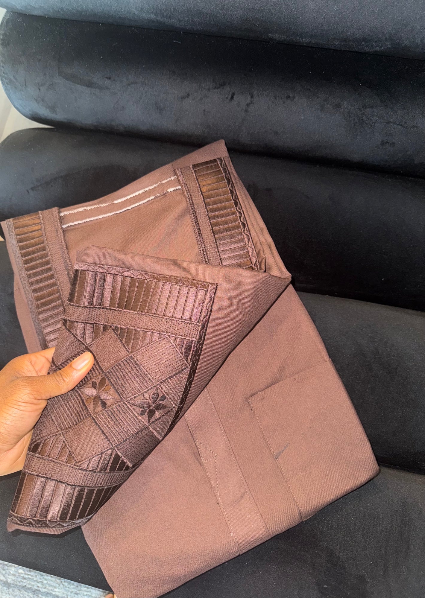 Elevate your wardrobe with our Ready-to-Wear Agbada, masterfully tailored for the modern gentleman. Crafted from a premium wool blend, this 3-piece ensemble blends cultural elegance with contemporary comfort. The rich brown hue, intricate embroidery, and soft anti-crease fabric speak volumes of refined taste and unmatched craftsmanship.